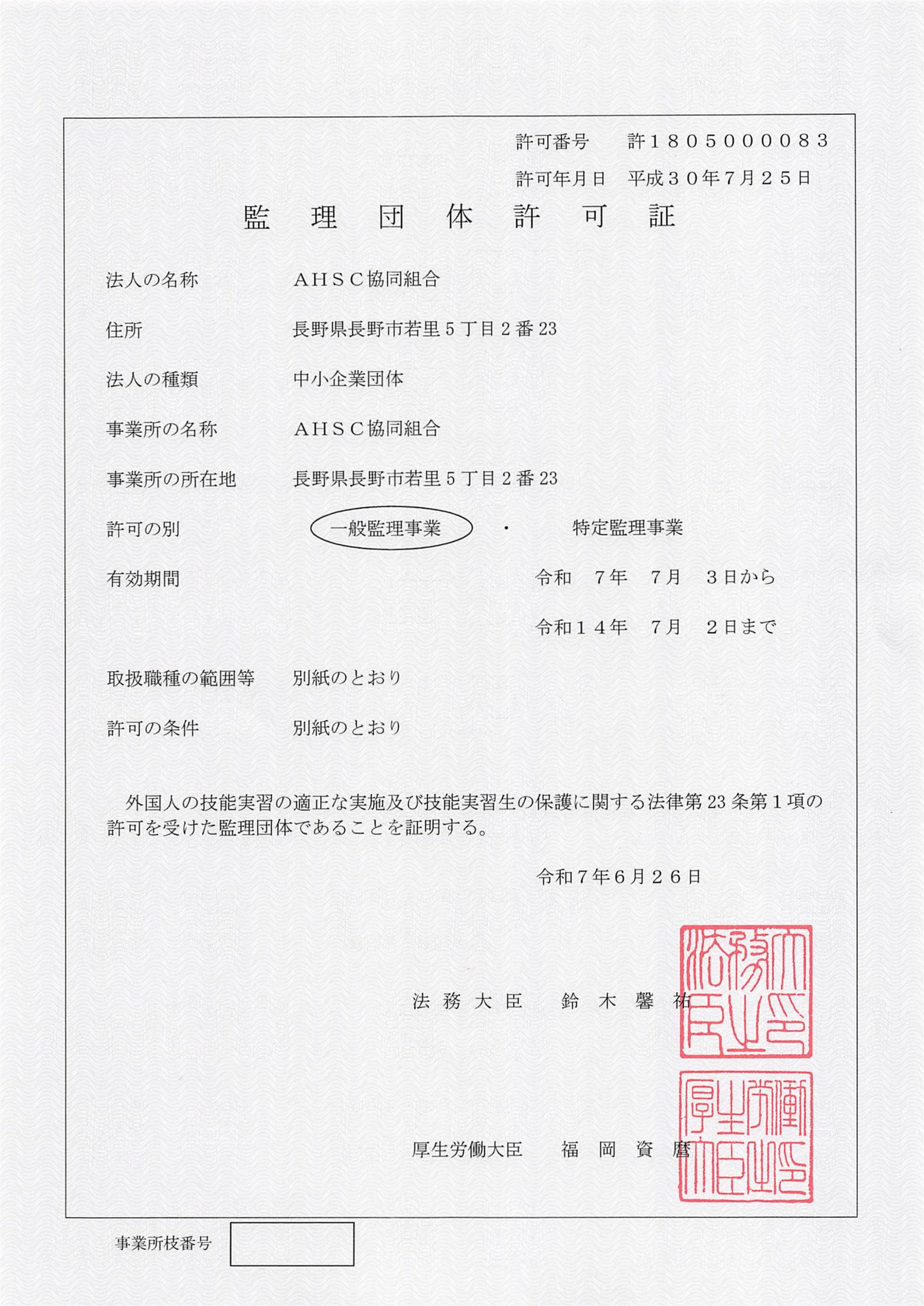 | 許認可 | 許1805000083 外国人技能実習機構 内閣府(警察庁) 厚生労働省 関東経済産業局 北陸信越運輸局 長野県知事 関東地方整備局 |